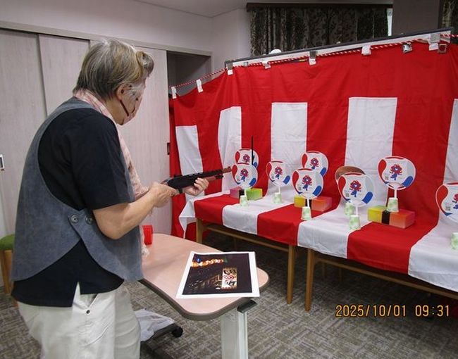 10月1日、酷暑が過ぎてやっと秋の気配を感じる日、施設のフロアーで秋祭りが催され、お手伝いに行ってきました。