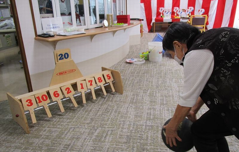 模擬ながら趣向を凝らしたボーリング、テニス、射的、ゴルフ、4ヶ所の設定ポイントをひと回りです。私達も職員さん達と共に声かけ励まし、出来たら手をたたきするうちに、眠ったままの方に反応が出てきたり、乗り気でなかった方に少しづつ笑みがこぼれる・・その様子が嬉しくて、いつの間にか皆さんと立場を超えて、楽しみました。