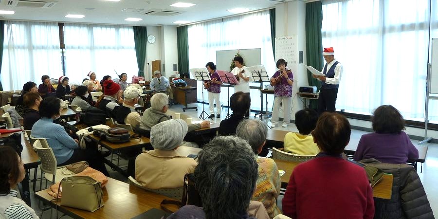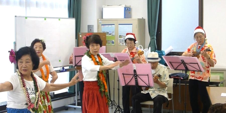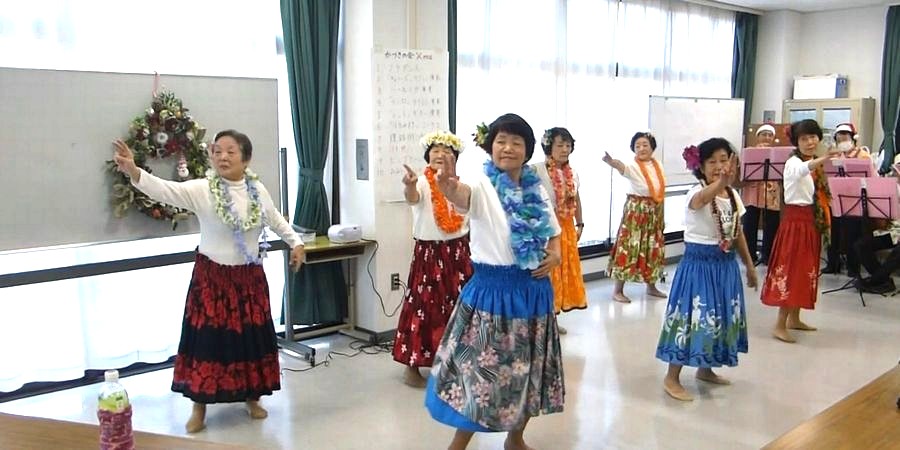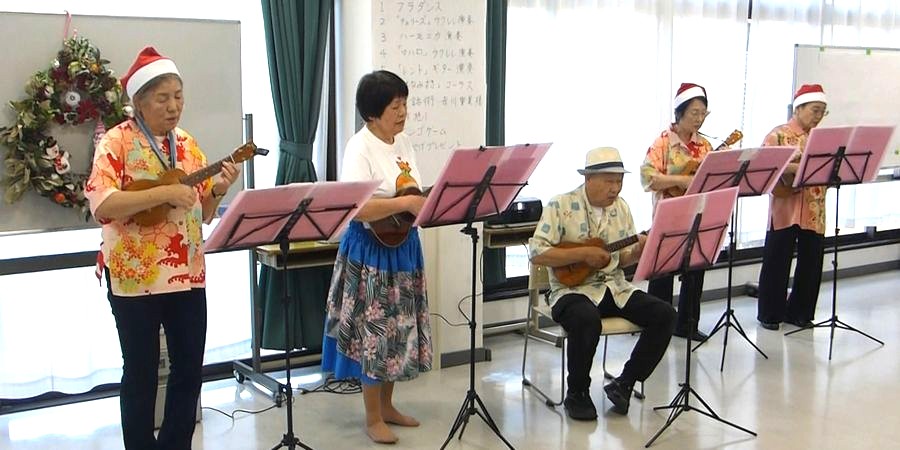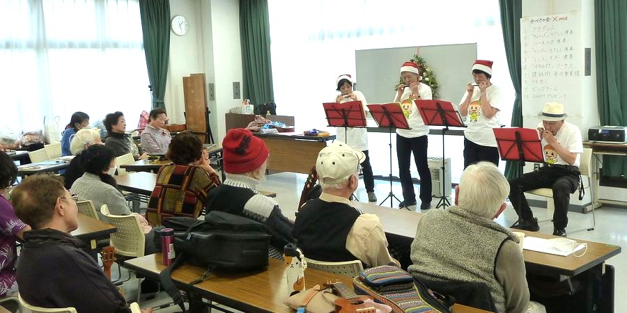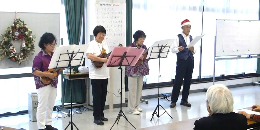 昨年のクリスマス会で、華々しくデビューしたフラダンスから始まり、様々な場所で活躍しているウクレレ、ハーモニカ、ギター、コーラスなど「かづきの会」の音楽サークルが総出演し、日頃の練習成果を披露しました。どの種目も皆さん生き生きとされている姿を見て、改めて趣味の醍醐味を感じました。