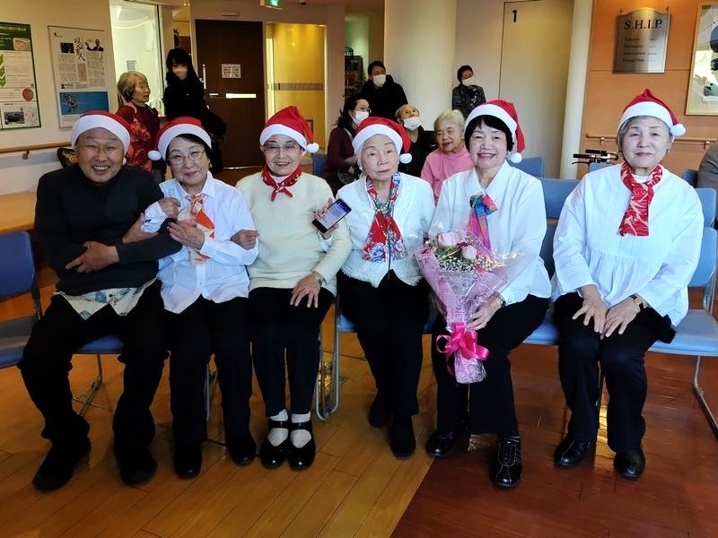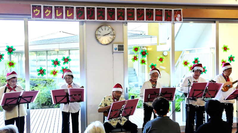 投稿者:大谷 稔子 投稿日:2026/1/7 12月7日(日)冷たい風が止み穏やかな青空が広がった日、クリスマス会でチェリーズの6人がウクレレ演奏を披露しました。こちらで第2の人生を送られているナルクの会員さんとお会いできるのも楽しみです。お元気にされているかな?大丈夫でした。笑顔で迎えていただき、ご一緒にウキウキと演奏できました。 会場に集まって下さった皆様、和んでもらえましたか?気分転換していただけましたでしょうか?私達も共に歌い、手拍子やたくさんの拍手もいただき、有意義な時を過ごさせていただきました。来年のクリスマス会にも又、お会いしましょうねー。