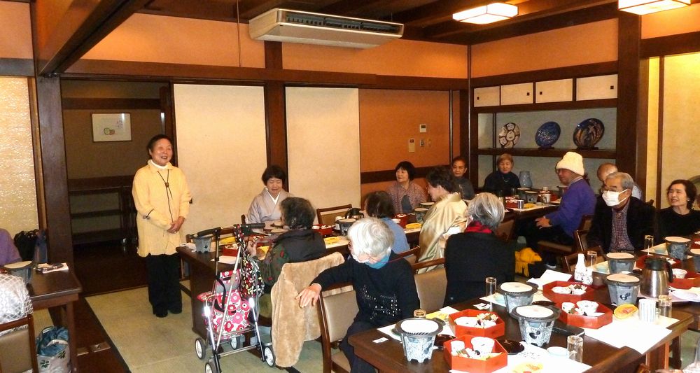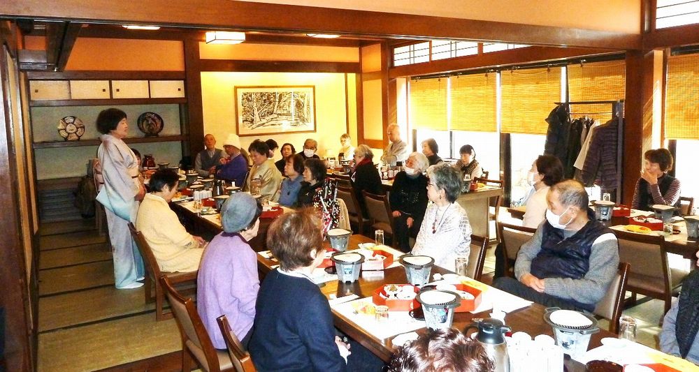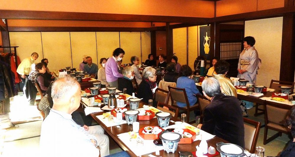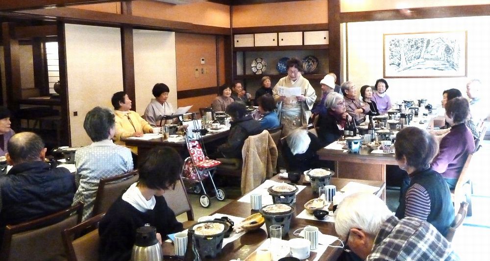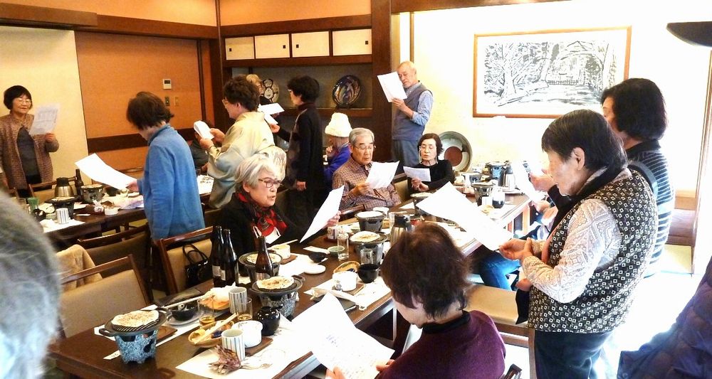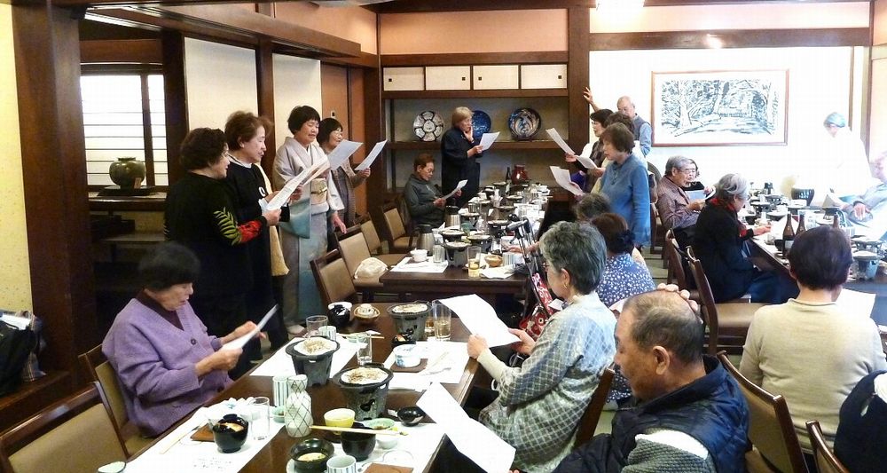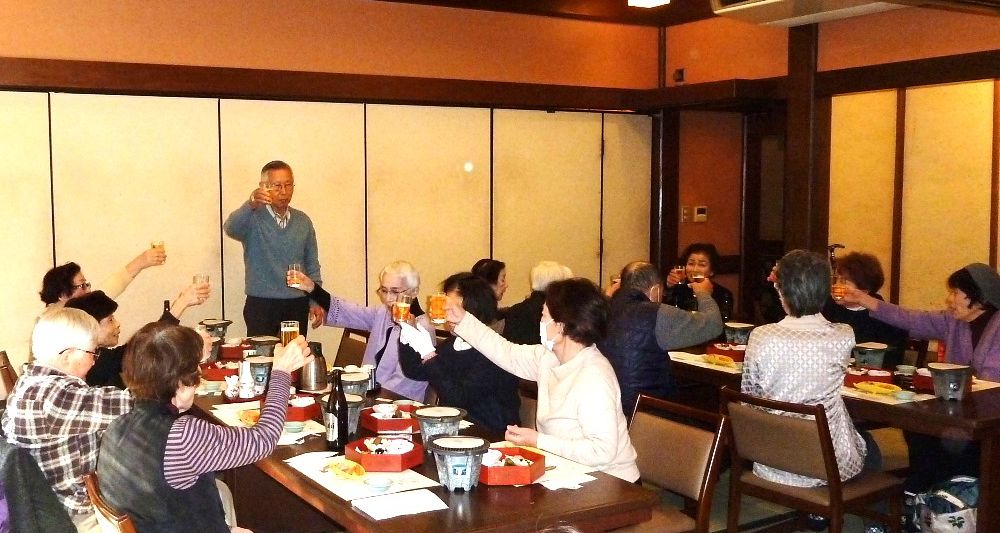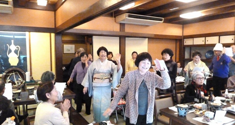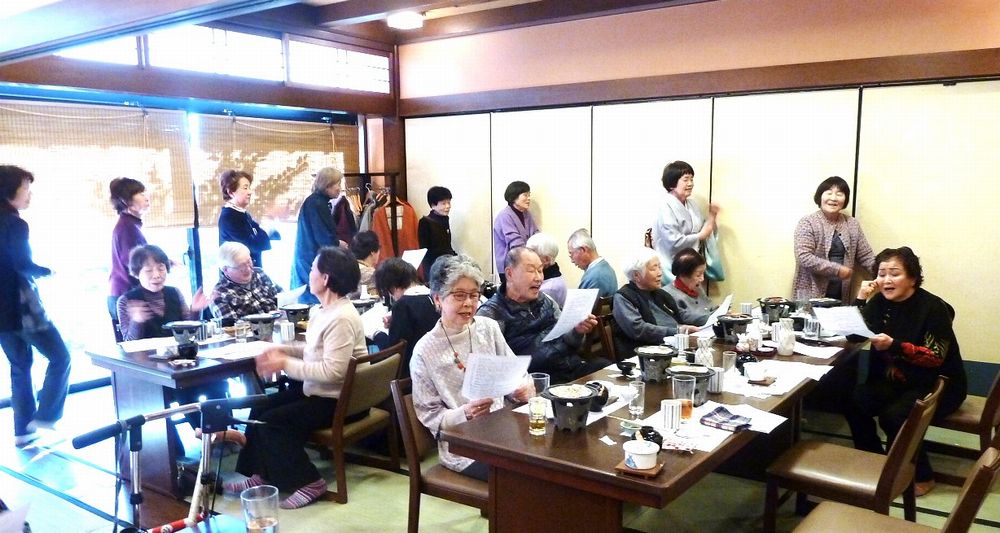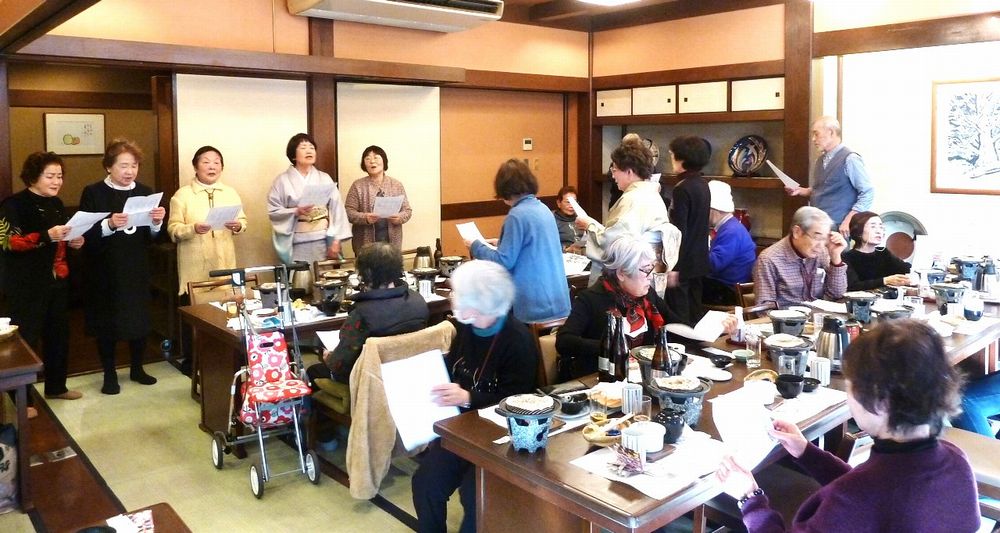 97歳になられお元気で、きれいな着物姿の松川さんのお話に納得、私もそうありたいと思いました。皆で歌った「ぼけます小唄」でちょっと耳が痛い。「ぼけない小唄」では、1つでも出来ることを増やそうと励まされ、「生涯現役の歌」では発破をかけられ、「我ら人生70から」でこれからいつ迎えがあっても上手に断ろうと決めました。来年も再来年も楽しい新年会に参加して皆で盛り上がりましょう。